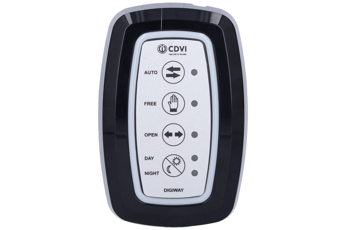 The DWCP is an external control panel that can be connected to the CDVI door operators (DIGIWAY Plus and DIGIWAY SR). It replaces the external side switch of the unit that controls the operating mode of the door, allowing operation away from the door in a convenient area. The panel allows users to set the operating mode to: ‘Automatic’, ‘Door Free’ and ‘Door Open’ without having to touch the door operator. It can also set ‘Day/Night’ mode, disabling the external door sensors at night.