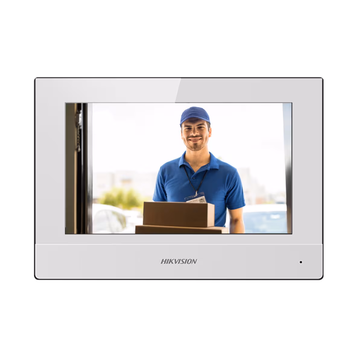 The 7 inch IP Video touch monitor DS-KH6320-WTE1-W is an essential addition to your modular video door entry kit. It lets you answer visitors via the intercom. The DS-KH6320-WTE1-W monitor features a full-color touch screen. It’s also possible to unlock access remotely from your Smartphone using Hikvision’s dedicated app.