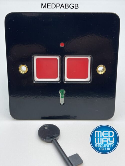 Grade 2 Double push PAB Button. Panic button which can be fitted to a standard single gang back box. The Panic button comes complete with a LED Indicator. Finished in Gloss White